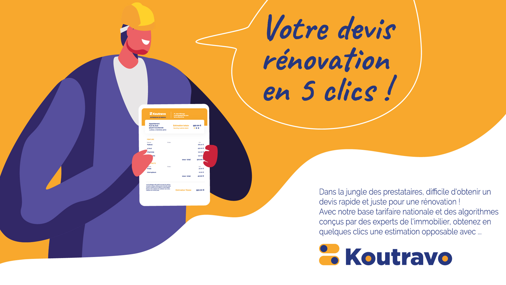 KOUTRAVO, www.koutravo.fr seul capable sur le marché, grâce à ses algorithmes, son IA et ses statistiques, de délivrer de façon facile et ludique, en moins d’une minute, le cout de rénovation détaillé d'un bien, aux prix "marché", par pièce, par prestation (embellissements, plomberie, chauffage, électricité, menuiserie, cuisine, travaux énergétiques, étiquette énergétique avant/après travaux, etc.…).